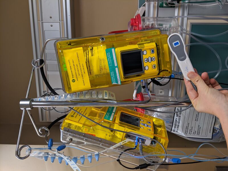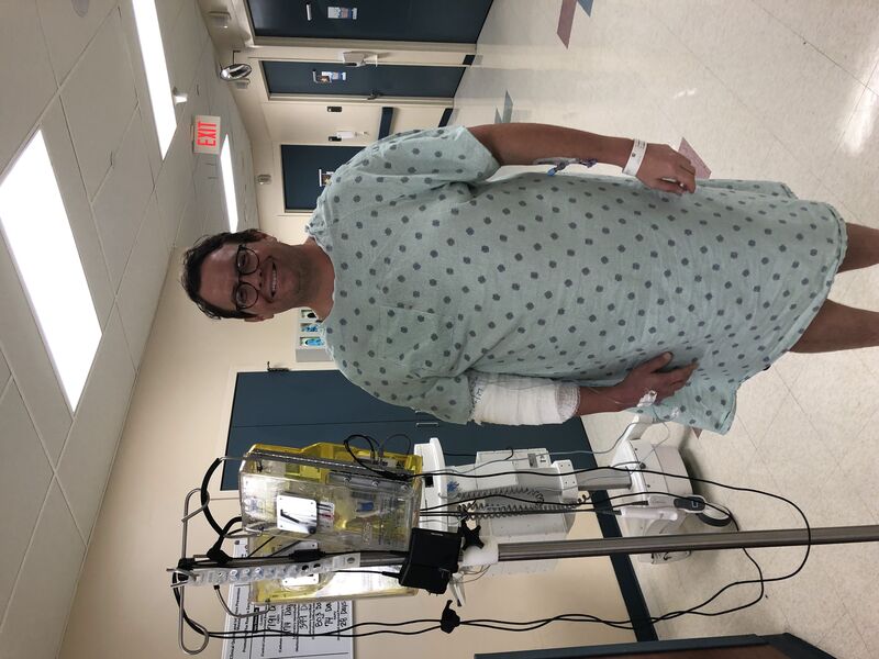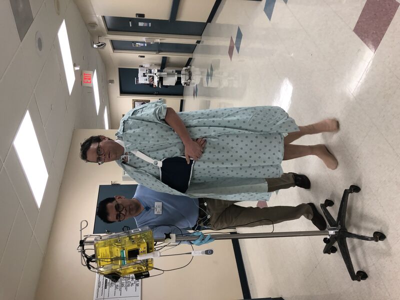Thursday morning I'm feeling stronger than the day before. I'm up walking with my nerve blocks on a pole and carrying my lung blood box in my left hand.