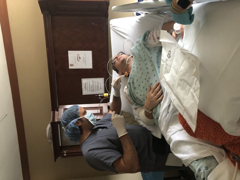 I was given some shots to numb the area. My rib nerve blocks also helped to hide the pain. Sarah was sitting next to me on my left side. I held her hand while listening and feeling the last hard push as a plastic tube was shoved in my right side and into my lung.