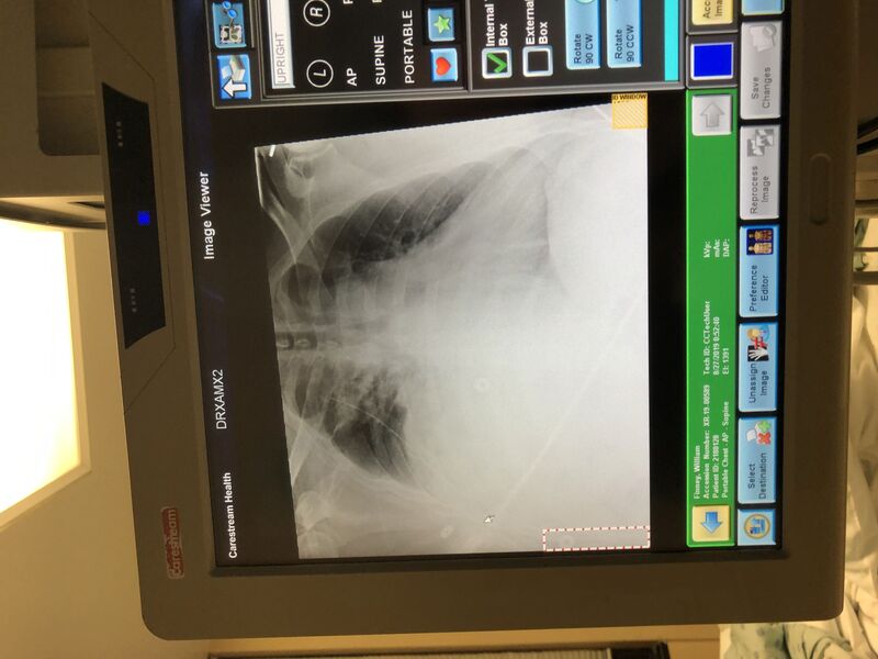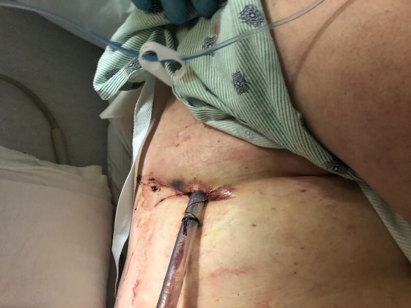 I could hear a small amount of blood splatter on the floor after the last hard push. I thanked the Doctor for putting in the tube. His response was, "I've never been thanked for a chest insertion" This took place around 1am Monday night (Tuesday morning). I was able to get about 3 hours of sleep before waking up for something. X-rays, blood draws, breathing exercises, it was constant for the next few days.